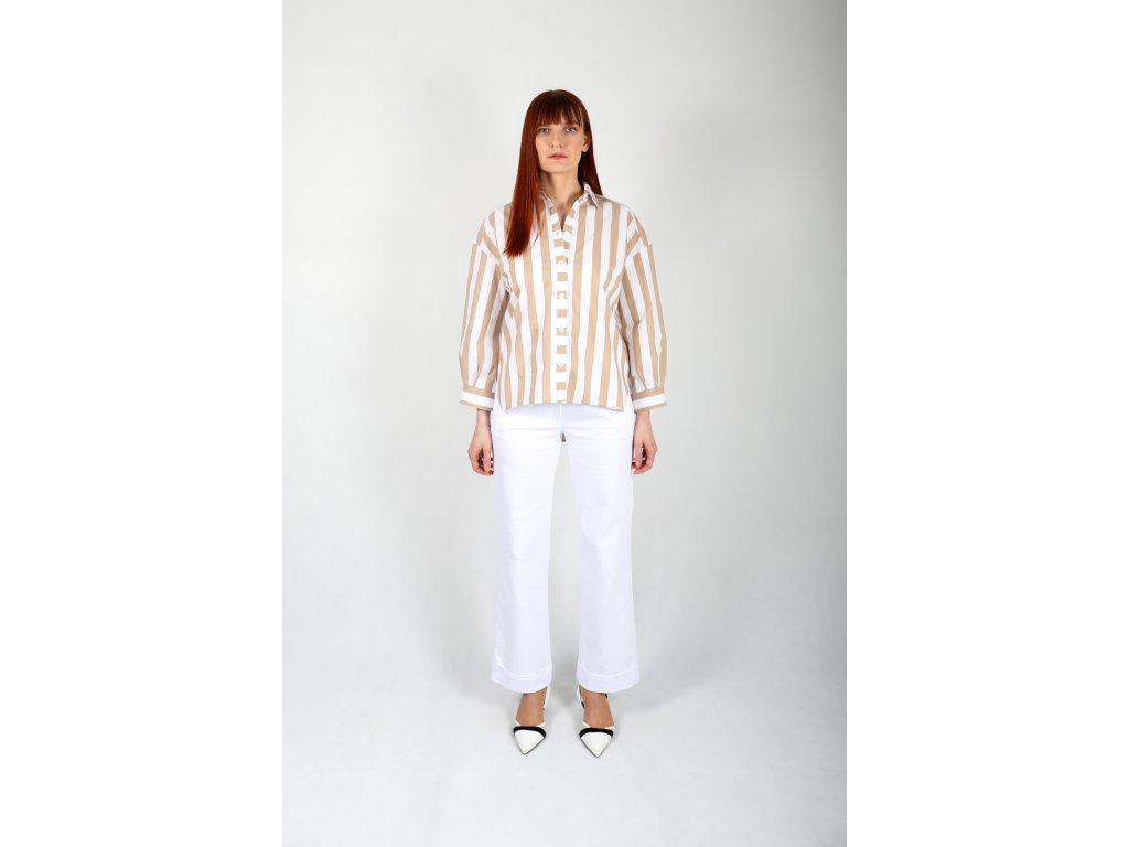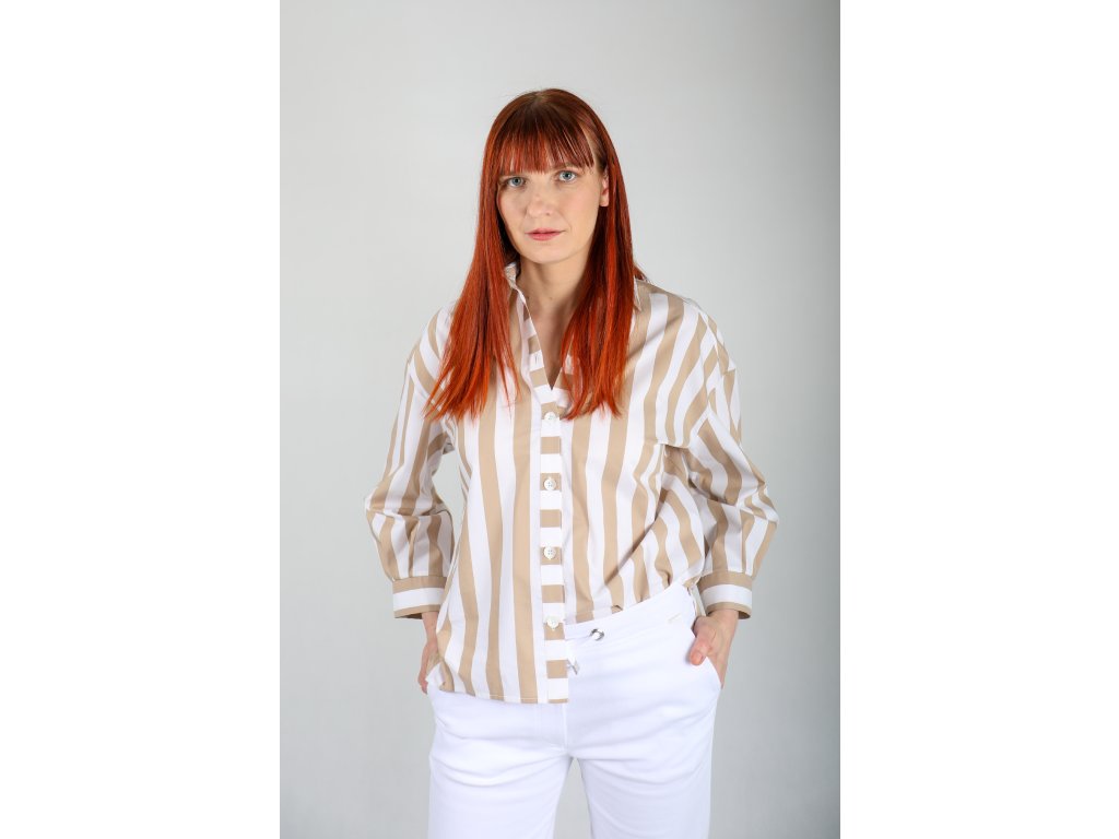 Pruhovaná bavlnená blúzka s dlhým rukávom – béžovo-biela